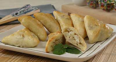 Тесто тонко раскатайте, вырежьте кружочки диаметром 10 см. В центр каждого кружочка положите начинку и сформуйте пирожки треугольной формы. Выложите пирожки на смазанный маслом противень, смажьте взбитым яйцом.