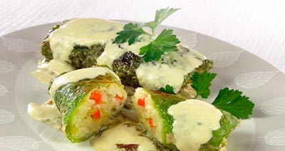 Кочан капусты разберите на листья. 8 листьев бланшируйте, остальные порубите. Для начинки морковь и картофель нарежьте кубиками, лук-порей - кольцами. Репчатый лук спассеруйте на сливочном масле, добавив морковь и лук-порей. Рис отварите до полуготовности, смешайте с пассерованными овощами, добавив сыр, желтки, соль и картофель. Заверните начинку в капустные листья. Обжарьте голубцы на растительном масле до полуготовности и выньте. На этом же масле обжарьте оставшуюся капусту. Влейте бульон, положите голубцы и тушите 25 минут. Добавьте сливки, горчицу и прогрейте образовавшийся соус. Подавайте голубцы вместе с соусом.