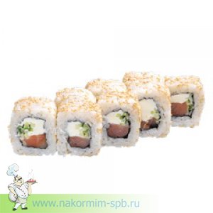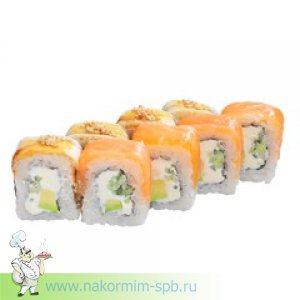 Состав: сыр, лосось, огурец, угорь, креветка, соус, тобико красная