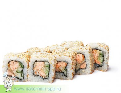 Состав: огурец, тобико, копченый лосось, сыр, рисовое тесто