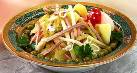 Ветчину, мясо, картофель, яблоки, огурцы, очищенные от кожицы и семян шинкуют соломкой, заправляют майонезом, укладывают в салатник, украшают яйцом, зеленым горошком, маринованными фруктами, огурцом и зеленью петрушки.