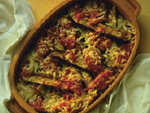 Баклажаны разрезают вдоль пополам, и мякоть надрезают крест на крест. Укладывают баклажаны разрезом вниз и обжаривают в растительном масле. Затем мякоть выскабливают ложкой, рубят, смешивают с тушеным луком, отварным рисом и отварной бараниной. В массу вводят соль, перец, сырое яйцо и все тщательно перемешивают. Половинки баклажанов заполняют этой смесью, посыпают тертым сыром, сбрызгивают растительным маслом и запекают в жарочном шкафу.
