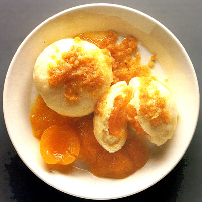 Картофель отварить, натереть на терке, добавить муку, яйцо и жир, замесить тесто. Доску хорошо посыпать мукой и раскатать на ней тесто толщиной 3 мм. Раскатанное тесто разделить на квадраты одинаковой величины с таким расчетом, чтобы на каждый квадрат можно было положить целый абрикос. А вместо косточки в каждый абрикос следует поместить кусочек сахара. Сформировать клецки и варить их в подсоленной воде под крышкой до тех пор, пока они не всплывут. Затем отбросить на дуршлаг и дать стечь воде. Обвалять клецки в толстом слое панировочных сухарей, посыпать сахаром и обжарить в большом количестве жира. Затем снова посыпать сахаром и в горячем виде подать на стол.