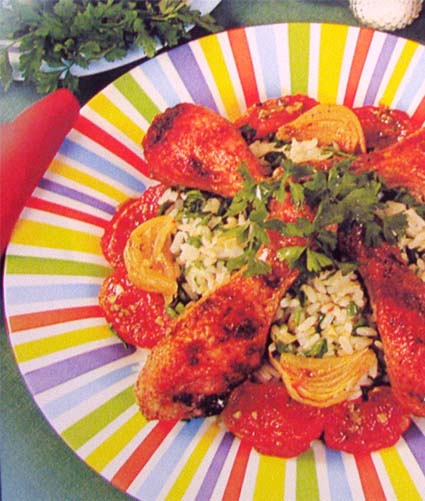 Пропустите жгучий перец через мясорубку вместе с двумя зубчиками чеснока, а остальной чеснок нарубите. Смешайте оливковое масло с уксусом, добавьте смесь жгучего перца с чесноком и соль. Лук и помидоры нарежьте, выложите в пароварку, сверху положите куриные ножки, поперчите и залейте соусом. Тушите в пароварке 30-40 минут. Рис отварите до готовности, смешайте с оставшимся сливочным маслом. Смешайте зелень петрушки с рубленым чесноком. Куриные ножки, помидоры и лук выложите на блюдо, полейте оставшимся от тушения соусом и выложите рис.