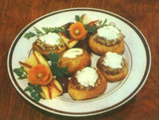 Мясо пропустить через мясорубку, смешать с жареным луком и сваренным до полуготовности рисом, обжарить. Из очищенных овощей вынуть сердцевину, наполнить их фаршем, слегка обжарить, сложить в сотейник, залить сметанным соусом и тушить. При подаче к столу полить сметанным соусом. Соус готовят так: муку спассеровать, охладить, смешать с растопленным маслом, влить в кипящую сметану, размешать, заправить перцем и солью, добавить томат-пюре. Проварить 3-5 минут и процедить.