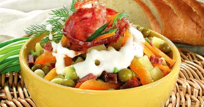 Свареные и очищеные картофель и морковь нарезают кубиками, добавляют нарезанную кубиками колбасу, стручковый перец, зеленый лук, зеленый горошек, солят и заправляют майонезом.