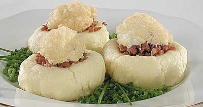 Картофель сварите в подсоленной воде до готовности, подсушите и протрите горячим. Добавьте сливочное масло, яичный желток, горячее молоко и хорошо перемешайте. Мелко нарезанные лук и чеснок обжарьте в разогретом растительном масле до золотистого оттенка, затем добавьте фарш, вино, соль, мускатный орех, перец и тушите в течение 20 минут. Положите сухари и перемешайте. Из картофельной массы сформуйте шарики, уложите их на смазанный маслом противень, в центре сделайте углубление и заполните его мясной начинкой. Взбейте яичный белок до устойчивой пены и разложите сверху на начинку. Запекайте гнезда до золотистой корочки в духовке при 240 С.