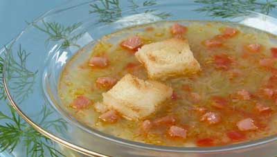 Лук и чеснок мелко порубите, обжарьте на масле, добавьте мелко нарезанные помидоры без кожицы и тушите овощи несколько минут. Капусту или шпинат мелко нашинкуйте, соедините с тушеными овощами, влейте воду, посолите, поперчите и варите суп до готовности капусты. Окорок нарежьте кубиками, слегка обжарьте и положите в суп. При подаче в каждую тарелку положите по 2гренка и залейте их супом.