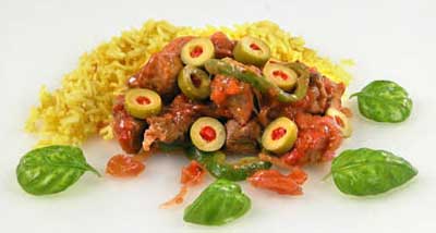 На оливковом масле обжарьте до подрумянивания свинину, нарезанную кубиками. Уменьшите нагрев, добавьте нашинкованный лук и обжаривайте его до золотистого цвета. Добавьте нарезанные помидоры. Влейте, помешивая, вино и доведите до кипения. Тушите в духовке 2часа при 150 С. Добавьте сладкий перец, нарезанный кольцами, и тушите еще 30 минут. Для шафранового риса мелко рубленный лук обжарьте на сливочном и оливковом масле до размягчения. Добавьте шафран, рис, посолите, поперчите и перемешайте. Влейте 3 стакана куриного бульона, доведите до кипения, накройте крышкой и уменьшите огонь до минимума. Варите до размягчения риса и впитывания бульона. Подавайте тушеное мясо с рисом, оформив базиликом.