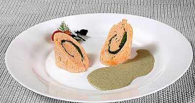 Шпинат припустите. Осьминога отварите, мелко нарежьте, затем измельчите в блендере, добавьте яйцо, томат-пюре. Приготовленную массу уложите в виде прямоугольника на пергамент, сверху выложите шпинат, сверните рулетом. Припустите до готовности со специями. Подайте с соусом бешамель, смешанным с перцем. Оформите помидором и зеленью.