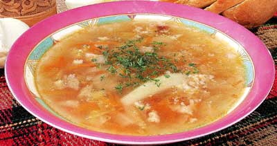 Свинину отварите, нарежьте кусочками и храните в бульоне. Отжатую квашеную капусту потушите до полуготовности с добавлением жира, снятого с бульона при варке свинины. Нарезанные соломкой коренья и половину нормы лука спассеруйте на масле. Сало пропустите через мясорубку и разотрите в ступке с оставшимся нарезанным луком, зеленью петрушки и промытым пшеном. В процеженный мясной бульон опустите нарезанный брусочками картофель и варите 10-15 минут, затем добавьте капусту, растертое с салом и зеленью пшено, лавровый лист, перец, пассерованные коренья и варите до готовности. При подаче разложите в тарелки мясо и залейте супом.
