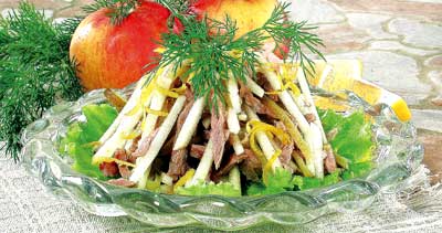Все ингредиенты салата нарежьте соломкой, полейте лимонным соком или уксусом, поперчите по вкусу. Заправьте салат майонезом.