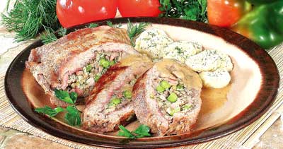 Мясо натрите солью и перцем. Сделайте продольный надрез на всю глубину куска, разверните его и слегка отбейте. Мелкорубленый лук спассеруйте на части масла. Добавьте мелко нарезанные ветчину, зелень и вареный горох, вбейте яйца. Хорошо размешайте. Полученным фаршем начините ростбиф, края разреза скрепите шпильками. Обжарьте ростбиф на оставшемся масле с обеих сторон, добавьте бульон и тушите до мягкости. Выньте ростбиф, в образовавшийся бульон добавьте подсушенную муку, разведенную частью бульона, и, постоянно помешивая, проварите на слабом огне. Процедите. Положите в соус мясо, прогрейте. Подайте, нарезав поперек ломтиками, с жареным картофелем или клецками.