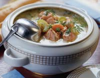 Овощи очистить. Картофель и морковь нарезать небольшими кубиками. Белую часть порея измельчить и обжарить до прозрачности. Переложить лук в кастрюлю, добавить морковь и картофель. Влить 1 л воды, довести до кипения и варить на небольшом огне 10 мин. Рыбу нарезать кусочками и выложить в кастрюлю с овощами. Добавить рубленый сельдерей и зеленый горошек. Приправить солью, перцем и тмином. Варить 5 мин. Затем влить в суп молоко, перемешать. Довести до кипения, снять с огня. Посыпать укропом и подавать.
