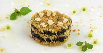 Сухари смешайте с половиной сахара и, постоянно помешивая, обжарьте на сливочном маргарине. Оставшимся сахаром засыпьте подготовленную чернику, добавьте немного воды и слегка проварите ягоды. Чередуя, ягоды и сухари уложите в форму и хорошо охладите. При подаче выложите приготовленный десерт из формы и полейте лимонным соком, смешанным с сахарной пудрой, посыпьте измельченным миндалем.