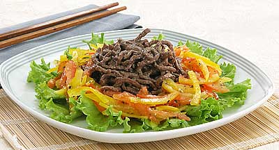 Мякоть говядины нарежьте соломкой и обжарьте на части масла до готовности. Посолите, поперчите. Помидоры и сладкий перец мелко нарежьте, соедините с яблочным уксусом, оставшимся маслом, измельченным чесноком, перемешайте и поставьте в холодильник на 1 час. Горячее мясо и охлажденную овощную смесь выложите на блюдо, выстланное листьями салата.
