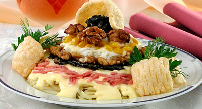 Для приготовления салата ветчину, картофель, лук, чернослив (часть оставьте для оформления), яйца нарежьте соломкой. На плоское блюдо уложите слоями картофель, лук, ветчину, чернослив, грецкие орехи, кукурузу и яйца, покрывая каждый слой майонезом. Салат оформите грецкими орехами, крабовыми чипсами и зеленью.