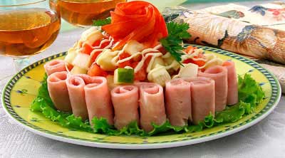 Ветчину нарежьте ломтиками и сверните в виде трубочек. Огурцы, яблоки, сельдерей, часть помидоров нарежьте кубиками, заправьте апельсиновым соком, посолите и перемешайте. На блюдо разложите листья салата, на них в виде бордюра разместите трубочки ветчины. В центре выложите овощи, заправленные майонезом. Оформите ломтиками помидоров и зеленью.