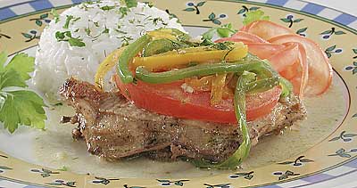 Сладкий перец очистите от семян, нарежьте соломкой, помидор - кружочками. Чеснок мелко порубите. Цыпленка разрубите на четыре части. Лук мелко нарежьте, обжарьте в сале, добавьте кусочки цыпленка, сладкий перец, помидор, чеснок. Посыпьте солью, паприкой, закройте крышкой и тушите при слабом нагреве почти до готовности. При необходимости подлейте воду или бульон. Муку подсушите без изменения цвета, слегка охладите и смешайте со сметаной и сливками. Полученный соус влейте в паприкаш и тушите еще 10 минут. При подаче посыпьте паприкаш рубленой зеленью, гарнируйте рассыпчатым рисом.