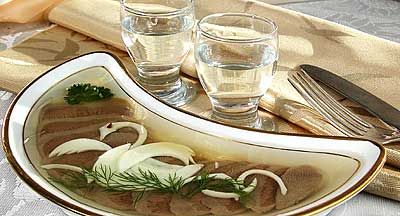 Приготовление желе: Из костей сварите бульон с добавлением лука и кореньев. Готовый бульон процедите. В горячий добавьте предварительно распущенный желатин. Затем добавьте соль, лавровый лист, перец горошком, корицу, уксус и введите половину яичных белков, смешанных с пятикратным количеством холодного бульона. Все это доведите до кипения. Готовое желе снимите с огня и через 15 минут процедите через марлю. Желе должно быть прозрачным.