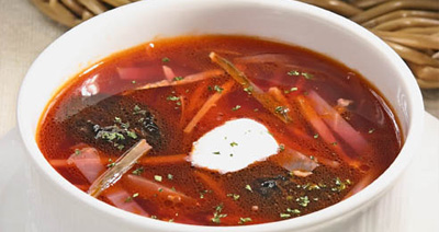 Грибы залейте 150 гр. холодной воды и оставьте для набухания на 2-3 часа. Затем в этой же воде грибы отварите, отвар процедите, грибы нарежьте соломкой и все вместе добавьте в борщ за 15 минут до готовности. Свеклу нарежьте соломкой, прогрейте в жире, добавьте сахар, пассерованный томат, бульон, немного уксуса и тушите до готовности свеклы. Морковь и лук нарежьте соломкой, спассеруйте. Нашинкуйте капусту и положите в кипящий бульон, варите 10-15 минут. Добавьте тушеную свеклу, пассерованные овощи и варите до готовности. За 10 минут до окончания варки добавьте соль, сахар, специи, грибы вместе с отваром. Чернослив отварите. Отвар добавьте в борщ, а чернослив положите в борщ при подаче. Подавайте со сметаной, посыпьте рубленой зеленью.