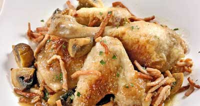 Бекон нарежьте соломкой и обжарьте до золотистого цвета. Курицу разделите на 8 кусков, запанируйте в муке, смешанной с солью и перцем, и обжарьте на жире, выделившимся при жарении бекона, до образования румяной корочки. Шампиньоны разрежьте на 4 части, потушите в сливочном масле и добавьте к курице. Подлейте куриный бульон, добавьте жареный бекон и тушите до готовности. При подаче выложите на блюдо, гарнируйте жареным картофелем.