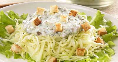 Капусту нашинкуйте соломкой, слегка перетрите с солью. Хлеб нарежьте мелкими кубиками и обжарьте. Филе сельди и огурец мелко порубите. Добавьте рубленую зелень, измельченный чеснок, майонез и перемешайте. Капусту выложите на листья салата, полейте заправкой, посыпьте гренками.