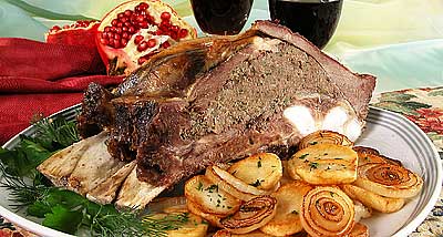 У телячьей грудинки с внутренней стороны вдоль реберных костей прорежьте пленки и срежьте с хрящей грудную кость. Во всю длину грудинки, начиная с тонкого ее конца, между наружным слоем мяса и слоем мяса, прилегающим непосредственно к ребрам, прорежьте пленки, чтобы получилось пространство в виде кармашка. Это пространство наполните фаршем, для которого телятину, шпик, язык пропустите через мясорубку, посолите, поперчите. Нафаршированную грудинку посолите, полейте маслом и жарьте в духовке, время от времени поливая выделяющимся соком. От готовой грудинки отделите реберные кости, нарежьте ее на куски и полейте мясным соком, полученным при жарке. На гарнир подайте жареный картофель, подпеченный лук. Оформите зеленью.