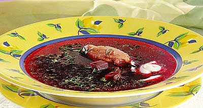 Кролика промойте, разделайте на филе, нарежьте на порционные куски. Залейте бульоном, добавьте очищенную и нарезанную кубиками свеклу, доведите до кипения и варите до готовности. За 10 минут до окончания варки положите лавровый лист, мелко нарезанные укроп и петрушку. Заправьте солью, перцем, влейте вино и доведите до кипения, но не кипятите. При подаче положите сметану.