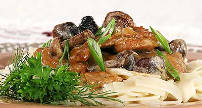 Мясо вымойте, обсушите, нарежьте ломтиками, посолите, поперчите по вкусу. Растительное масло разогрейте и обжарьте в нем ломтики свинины. Репчатый лук порубите и добавьте к мясу. Добавьте соевый соус к мясу и тушите 7 минут под крышкой. Лапшу отварите в подсоленной воде, откиньте на дуршлаг и дайте воде стечь. Грибы вымойте, разрежьте пополам, на четвертинки или ломтики, добавьте к мясу и тушите 3-5 минут. Влейте сливки и размешайте. Разложите на тарелки лапшу вместе с мясом, грибами и соусом, образовавшимся при тушении. Подавая на стол, украсьте зеленым луком, укропом, петрушкой.