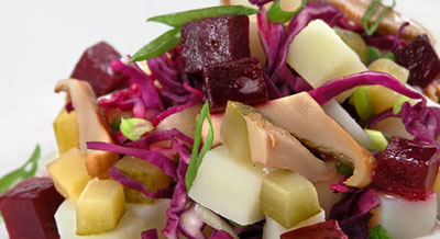 Свеклу нарежьте кубиками и полейте 1 столовой ложкой масла. Картофель и огурцы нарежьте кубиками, грузди - ломтиками. Подготовленные ингредиенты соедините, добавьте зеленый лук и перемешайте. Для заправки соль смешайте с сахаром, горчицей, введите уксус, оставшееся масло, перемешайте. Винегрет полейте приготовленной заправкой.