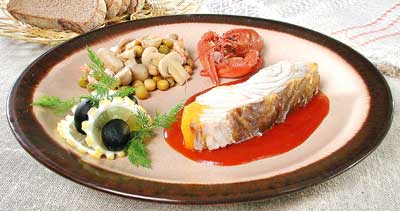 Осетрину ошпарьте кипящей водой, очистите кожу от костяных пластинок. Нарежьте порционными кусками, залейте горячей водой. Добавьте соль, очищенные и нарезанные коренья, перец. Припустите до готовности. Для гарнира зеленый горошек отварите, шампиньоны припустите в собственном соку, раковые шайки отварите и очистите. Для соуса муку спассеруйте на 20 гр. масла, слегка охладите, разведите небольшим количеством бульона, хорошо перемешайте. Влейте оставшийся бульон, перемешайте и прокипятите. К полученной массе добавьте пассерованный на оставшемся масле томат, соль и сахар по вкусу, проварите 10 минут. Выложите рыбу в центр блюда, вокруг разложите соус и гарнир. Оформите зеленью.