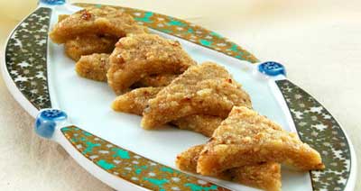 Манную крупу обжарьте на масле до светло-коричневого цвета. Мед, сахар и горячую воду соедините и проварите 5 минут. Полученным сиропом залейте обжаренную крупу, добавьте рубленые орехи, ванилин, перемешайте и охладите. Перед подачей нарежьте треугольничками.
