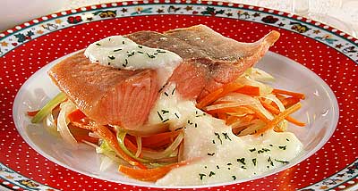Рыбный бульон соедините с вином (2 столовые ложки) и доведите до кипения. Положите рыбное филе и варите на слабом огне 20 минут. Репчатый лук нарежьте полукольцами, морковь - соломкой и ошпарьте кипятком. Воду слейте, полейте овощи маслом, посолите, поперчите. Рыбу достаньте из бульона, а бульон на сильном огне уварите в два раза. Добавьте творог, размешайте и проварите еще 5 минут. Взбейте 2 столовые ложки вина с желтками и заправьте ими бульон, посолите, поперчите. Рыбу подавайте с овощами, полив соусом и оформив зеленью.