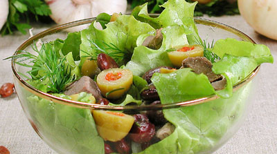 Лук мелко шинкуют и пассеруют на растительном масле. Мясо нарезают кубиками. Соединяют нарезанный соломкой зеленый салат, фасоль, лук, мясо, добавляют перец, рубленый чеснок и соль по вкусу. Оформляют салат оливками.