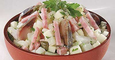 Колбасу, очищенные от кожицы яблоки и картофель нарежьте ломтиками, очищенные яйца и огурец - полукружочкам, сельдь - кусочками. Добавьте масло, тертый лук, горчицу, уксус, соль, перец, измельченную зелень и перемешайте. Шпик нарежьте мелкими кубиками, обжарьте, положите в салат горячим и хорошо перемешайте. Перед подачей поставьте салат на 30 минут на холод.