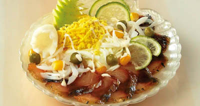 Рыбу и 1\2 лайма нарежьте ломтиками, кальмаров - тонкой соломкой. Яичные белки натрите на терке. Подготовленные ингредиенты салата соедините, добавив часть кукурузы и горошка, майонез. Перемешайте. Перед подачей оформите измельченными желтками, кукурузой, горошком, ломтиками лайма и яблока.