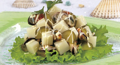 Мидий, картофель и огурцы нарежьте тонкими ломтиками, перемешайте и заправьте маслом. При подаче выложите на блюдо, выстеленное листьями салата, и оформите зеленью.