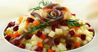 Очищенные свеклу, морковь, картофель, огурец, яблоко и лук нарежьте кубиками. Филе сельди нарежьте ломтиками. Нарезанные овощи и филе соедините, заправьте растительным маслом, посолите. При подаче оформите ломтиками сельди и зеленью.