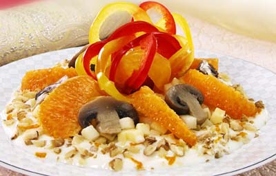 Шампиньоны промойте, разрежьте на несколько частей, потушите в собственном соку в течение 20 минут. Охладите. Сыр и очищенное от кожицы и сердцевины яблоко нарежьте мелкими кубиками. Перец очистите от плодоножек и семян, нарежьте тонкими кольцами. Мандарины очистите от кожуры и разделите на дольки. Соедините подготовленные продукты и заправьте соусом из йогурта, лимонного сока и апельсиновой цедры. Перед подачей посыпьте орехами.