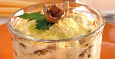Мякоть свинины и грибы нарежьте ломтиками. Сыр натрите на терке. Свинину обжарьте на масле, затем добавьте сметану и тушите 10 минут. Выложите тушеное мясо в кокотницу, добавьте ломтики грибов, посолите, поперчите, посыпьте тертым сыром и запекайте до образования золотистой корочки. При подаче оформите зеленью.