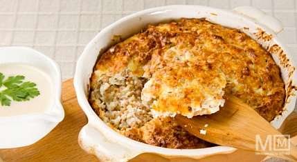 Творожная запеканка с соусом морнэ.