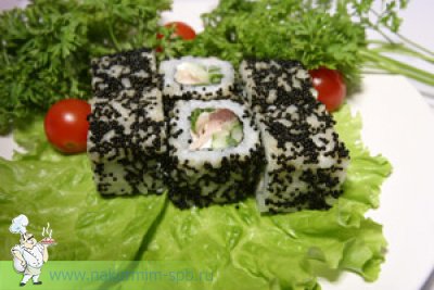 Состав: Рис, мясо краба, авокадо, икра летучей рыбы, сыр "Филадельфия", угорь копченый, кунжут